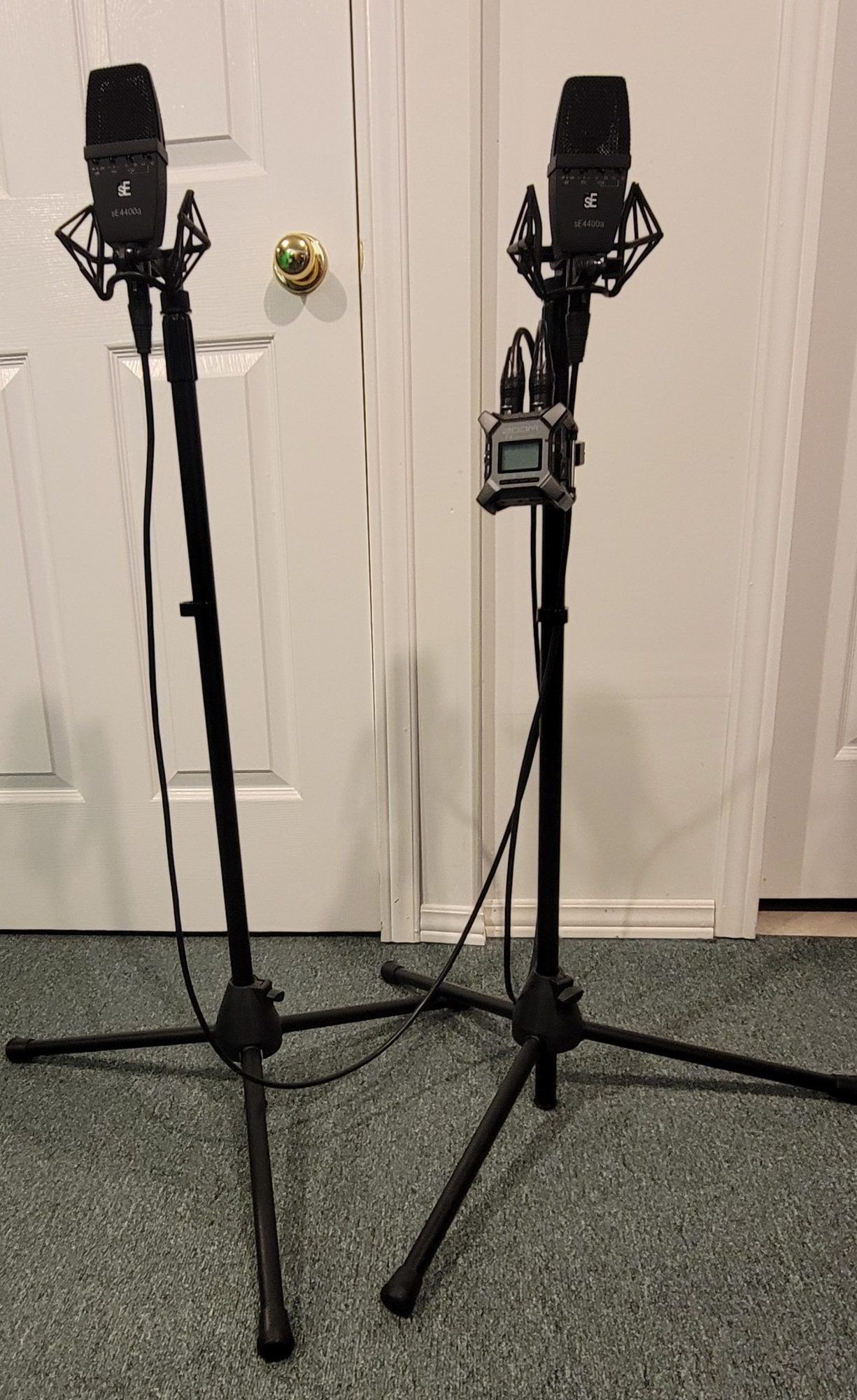 A super simple setup. The F3 is powered by rechargeable AA batteries and using a $6 superclamp, attached to one music stand, both mics are attached to it, set them apart, come in close… hit record on the F3 or in the Bluetooth F3 Zoom app… and play!