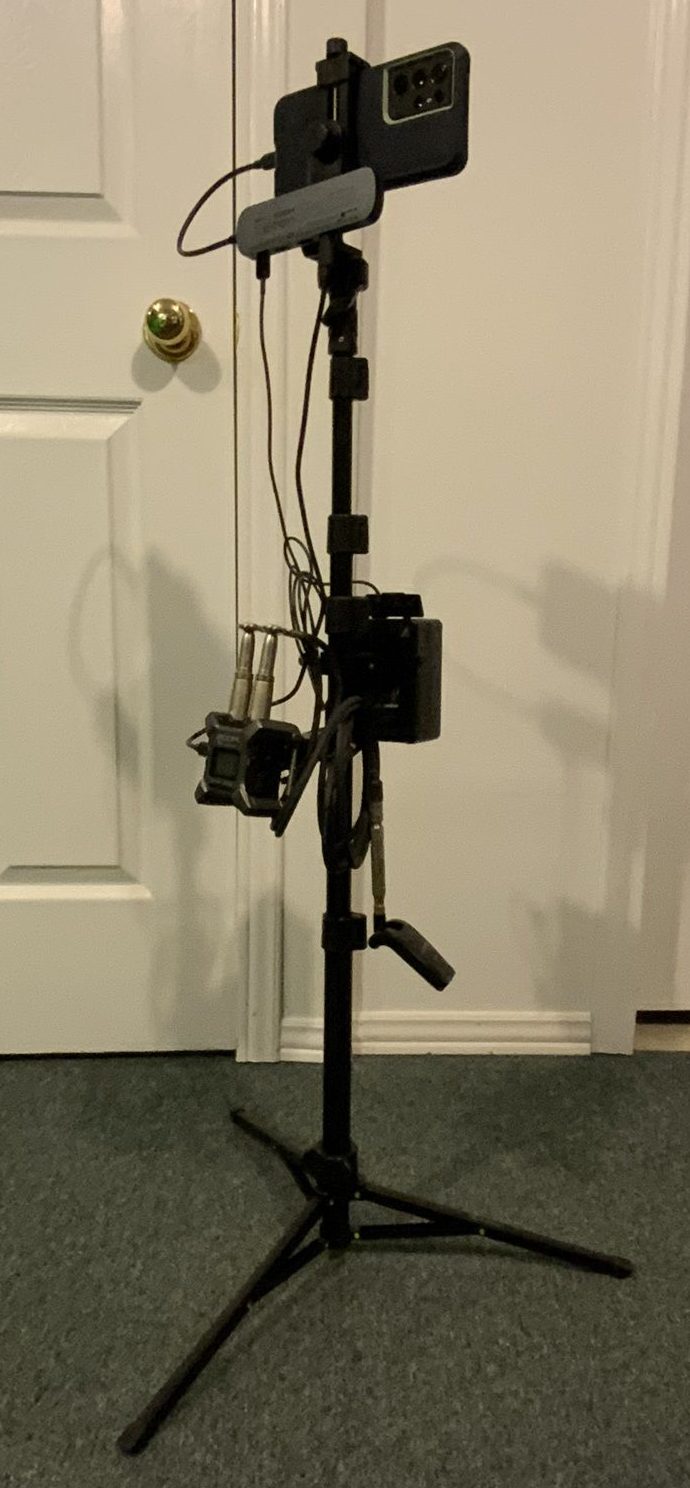 Want a more cooler complex setup? Do the above but add a small USB hub! Now add a V-mount battery and a wireless transceivers. You may now, plop down the stand ANYWHERE, and as long as you are within 100 feet, your audio gets saved to the F3 and straight on to the audio track of the cellphone at the same time you capture your video. The V-Mount battery lets you play for an easy 15-20 hours and charges both the cellphone and the F3 at the same time. The Ultimate vacation setup!